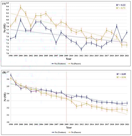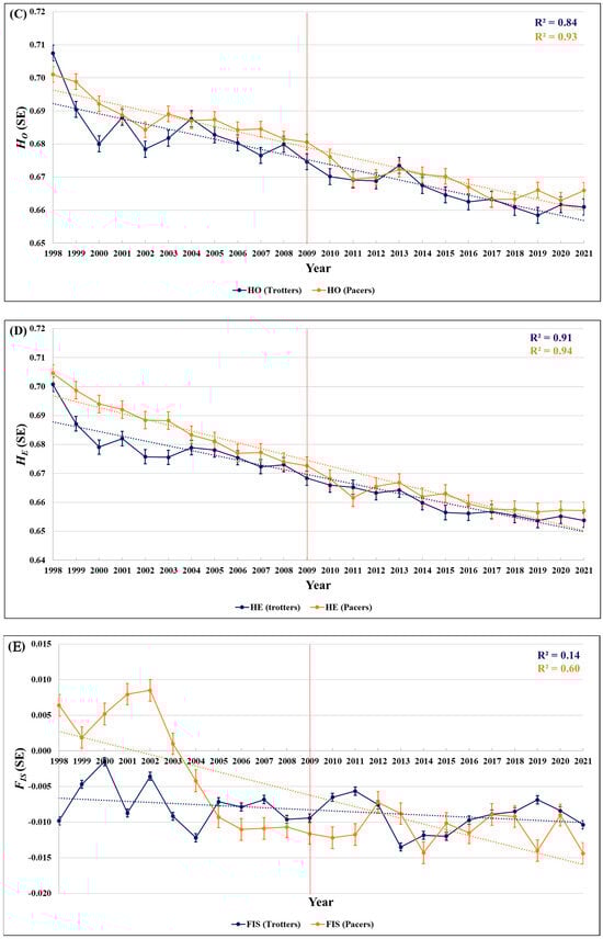 The Microsoft Excel add-in GenAlex v.6.5 was used to calculate the number of alleles (Na), number of effective alleles (Ne), expected heterozygosity (HE), observed heterozygosity (HO), and inbreeding coefficient (FIS) for each STR marker []. Then, the mean values for each diversity parameter were calculated by averaging the values of each locus. A pairwise fixation index (FST) using 20,000 permutations [] was also calculated between trotters and pacers for each year using the R v4.2.1 package hierfstat []. T-test comparisons of Na, Ne, HE, HO, and FIS between years and between the pre- and post-studbook cap time periods, as well as linear regression models (lm) of each diversity parameter between the pre- and post-studbook cap time periods, were calculated using R version 4.2.1 []. A Bonferroni-corrected significance level of P < 0.05 was used to determine t-test significance (PBonferroni =1 − (1 − x)n). The R package ‘emmeans’ version 1.8 [] was used to determine the statistical difference in slopes of regression lines between the 12-year time periods before and after the studbook cap (1998–2009 and 2010–2021), as well as for comparing half-generation time intervals: 1998–2003, 2004–2009, 2010–2015, and 2016–2021 (P < 0.05 for all tests).