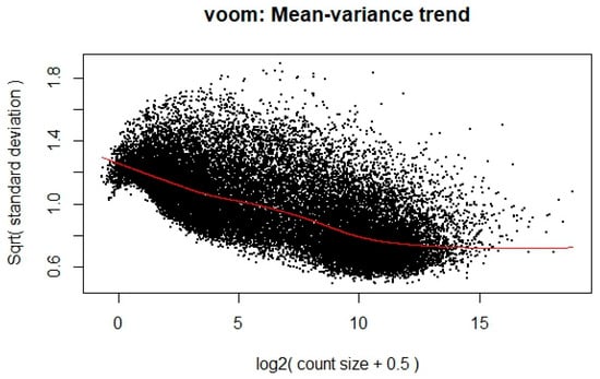 To ensure the appropriateness of the RNA-Seq data for linear modeling, a voom transformation was applied to stabilize the variance across the range of gene expression levels. This transformation is crucial for meeting the assumptions of linear modeling, particularly in handling the heteroscedasticity typical of RNA-Seq data. The transformation’s effect is illustrated in Figure 1, where each dot represents a gene. The x-axis shows the average log2 counts per million, while the y-axis displays the square root of the standard deviation. A clear downward trend is observed along the red trend line, indicating that genes with lower expression levels tend to exhibit higher variability, whereas highly expressed genes show more stable variance. This trend enables the calculation of observation-level precision weights, thereby improving the reliability of downstream differential expression analysis.