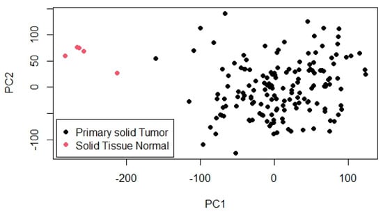 To further explore the overall structure and variability within the dataset, PCA was conducted. The PCA results are shown in Figure 2, which visualizes the projection of samples onto the first two principal components (PC1 and PC2). In this plot, primary solid tumor samples are represented by black dots and normal solid tissue samples by pink dots. A distinct separation between the two groups is evident, particularly along PC1, which captures the largest proportion of variance and serves as the main axis distinguishing tumor from normal samples. PC2 accounts for additional, though smaller, variation. This clear clustering pattern indicates substantial differences in gene expression profiles between tumor and normal tissues, highlighting the biological relevance of the data and supporting its suitability for identifying differentially expressed genes and building prognostic models.