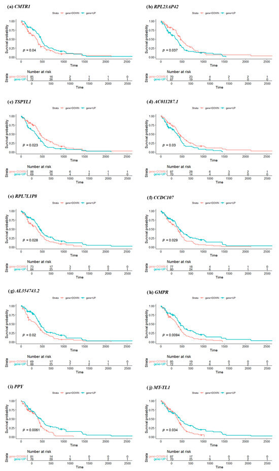 Kaplan–Meier survival curves comparing overall survival between patient groups stratified by gene expression level (UP = high expression, DOWN = low expression) for the top prognostic genes: (a) CMTR1, (b) RPL23AP42, (c) TSPYL1, (d) AC011287.1, (e) RPL7L1P8, (f) CCDC107, (g) AL354743.2, (h) GMPR, (i) PPY, (j) MT-TL1.