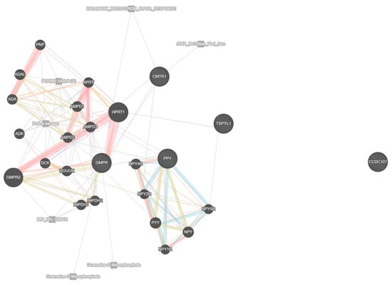 To further understand the biological functions and molecular interactions of the top 10 genes identified through machine learning and deep learning models, a network-based functional analysis was conducted. This analysis integrated diverse biological data sources, including co-expression, physical and genetic interactions, shared pathways, co-localization, and shared protein domains. The network was constructed for Homo sapiens, with the weighting based on biological process relevance to ensure a functionally meaningful arrangement. The resulting protein–protein interaction (PPI) network, shown in Figure 4, illustrates how the selected genes are embedded within a broader biological framework. In this network, the central 10 genes are enriched with additional interacting partners predicted.