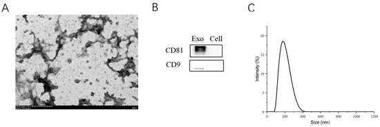Characterization of exosome. (A) Representative transmission electron micrograph of RBC-exo; (B) Western blot results show positive expressions of CD81 and CD63 proteins in RBC-exo. (C) Particle size distribution of RBC-exo measured by NanoSight system.