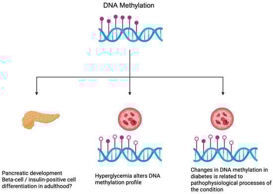 DNA methylation contributes to pancreatic development and pathophysiological mechanisms of diabetes. Created in BioRender. Physiology, D. (2025) https://BioRender.com/5iok4v8 (accessed on 20 May 2025).