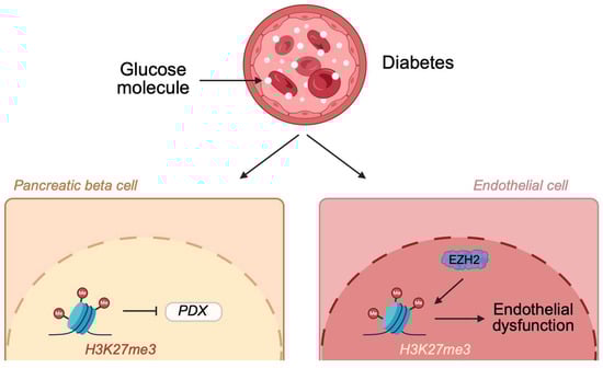 Higher glucose concentrations present in diabetes change the methylation profile, which affects the pathophysiology of diabetes. Specifically, it promotes the expression of H3K27me3, which is associated with dysfunction of pancreatic beta cells and endothelial dysfunction. Created in BioRender. Physiology, D. (2025) https://BioRender.com/zmk8oa4 (accessed on 20 May 2025).