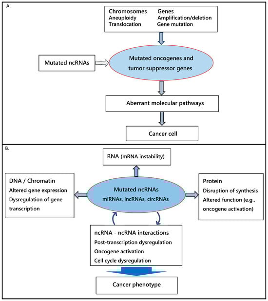 The interplay among the ncRNA species and their interactions with chromatin and proteins point to a different mechanism of tumorigenesis. Rather than an accumulation of discrete mutations in oncogenes and tumor suppressor genes, the dysregulation of the complex ncRNA regulatory network due to mutations affecting ncRNAs is the major driver of cancer development (Figure 1). This concept is discussed in the next section.