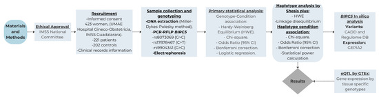 Additionally, an expression quantitative trait loci (eQTL) analysis was performed by correlating the genotypes of BIRC5 gene polymorphisms with the gene expression levels obtained from GTEx. Robust regression models were applied to assess the association between variants and expression, which is natively implemented on the platform. Figure 1 Flowchart summarizing the research design.