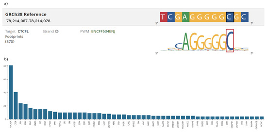 In silico analysis showed that this variant presented a raw score of 1.00 and a C-PHRED score of 10.35. The Conservation Score (ConsScore) was 1.00 among the annotations assessed by CADD. The motifE count was 1.00, reflecting that the variant affects a transcription factor binding motif. Additionally, the motifE HIpos was 0.00, indicating where the highest impact occurs in the affected motif. The motifE Score Change was −0.02, showing a change in the binding of the motif caused by the variant, which could alter the binding affinity of the transcription factor. The tOverlapMotif was 1.00, indicating if the variant overlaps with a known transcription factor binding motif. Lastly, the Motif Dist was 1.00, reflecting the variant location of the binding motif. Subsequently, using a RegulomeDB database revealed that the motif associated with this variant is a CTCFL (CCCTC-binding factor), formerly known as BORIS (Brother of Regulator of Imprinted Sites) (Figure 2a). This finding is corroborated by CADD prediction, which indicates the presence of a single regulatory motif in this region, suggesting a possible involvement in modulating BIRC5 gene expression.
