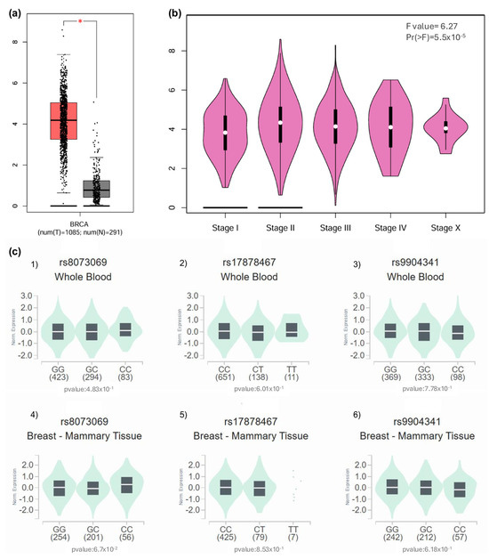 Analysis of BIRC5 expression in breast cancer tissues and eQTL investigation of rs8073069, rs17878467, and rs9904341 variants. (a) Overexpression of BIRC5 in Breast Cancer Tissue: The expression levels of BIRC5 were examined in breast cancer (BRCA) tissue using the GEPIA (Gene Expression Profiling Interactive Analysis) database. The results indicate that BIRC5 is significantly overexpressed in patients with breast cancer compared to normal breast tissue (p < 0.01), suggesting a potential role of BIRC5 in breast cancer pathogenesis. (b) BIRC5 Expression Across Tumor Stages: An analysis of BIRC5 expression across various tumor stages was conducted using the GEPIA database. The findings revealed significant variations in expression levels among the tumor stages (F value = 6.27, p < 0.001), indicating that BIRC5 expression correlates with tumor progression and may serve as a marker for disease progression. (c) eQTL Analysis of BIRC5 Variants in Whole Blood and Breast Tissue: (c1) Variant rs8073069: An eQTL (expression Quantitative Trait Loci) analysis was performed to assess the association between the rs8073069 variant in BIRC5 and its expression levels. In whole blood samples, no significant association was observed (p = 0.483). (c2) However, there was a trend toward significance (p = 0.067) in breast tissue, suggesting a potential tissue-specific effect that warrants further investigation. (c3) Variant rs17878467: The same eQTL methodology was applied to the rs17878467 variant. The analysis showed no significant association with BIRC5 expression in whole blood (p = 0.601). (c4) The analysis showed no significant association with BIRC5 expression in breast tissue (p = 0.853), indicating that this variant may not significantly influence gene expression in these tissues. (c5) Variant rs9904341: The eQTL analysis for the rs9904341 variant revealed no significant association with BIRC5 expression in whole blood (p = 0.778). (c6) The analysis showed no significant association with BIRC5 expression in breast tissue (p = 0.618). These results suggest that rs9904341 may not have a substantial impact on the regulation of BIRC5 expression in the examined tissues.