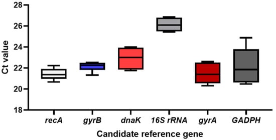 The CT value serves as an indicator of the expression level of a reference gene. Generally, a lower CT value corresponds to a higher initial gene copy number, indicating a higher expression level. Conversely, a higher CT value indicates a lower initial gene copy number and a lower expression level. Analysis of the box plot displaying the CT values of six candidate reference genes (Figure 1, Table S5) reveals that recA, gyrB, gyrA, and GAPDH exhibit relatively small CT values, while dnaK and 16S rRNA display larger values. Regarding expression levels, recA, 16S rRNA, dnaK, and gyrA demonstrate a narrow fluctuation range, whereas gyrB and GAPDH exhibit a broader range. In terms of distribution, recA, 16S rRNA, dnaK, and gyrA show a more concentrated distribution, whereas gyrB and GAPDH are more dispersed. Consequently, it can be tentatively concluded that recA, 16S rRNA, dnaK, and gyrA exhibit greater stability in expression levels compared to other genes and are suitable as candidate reference genes.