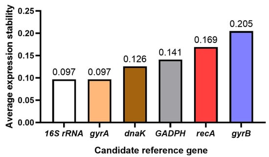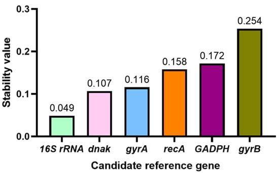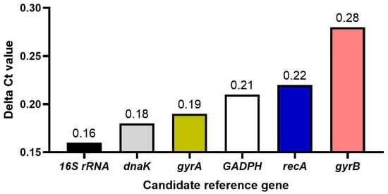 Candidate reference gene expression stability analysis. Analysis of Delta Ct values: The relative expression of the six candidate reference genes under control and experimental conditions was evaluated. The average Ct value of each amplicon in each sample was calculated using the original Ct value. The results showed that (Figure 2), among the six candidate reference genes, the expression of the 16S rRNA gene was the most stable, followed by the dnaK gene, and the most unstable expression was the gyrB gene.