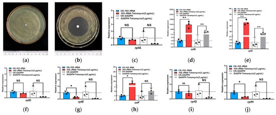 Analysis of the quorum-sensing-related gene expression in Xoo under tetramycin stress. Note: (a) The drug sensitive test of Xoo strains LF21-38 under the tetramycin with minimum inhibitory concentration; (b) The drug sensitive test of Xoo strains LF21-38 under sterile water as control; (c) relative quantitative results of rpfA; (d) relative quantitative results of rpfB; (e) relative quantitative results of rpfC; (f) relative quantitative results of rpfD; (g) relative quantitative results of rpfE; (h) relative quantitative results of rpfF; (i) relative quantitative results of rpfG; (j) relative quantitative results of rpfH. (“*” Significant, p < 0.05, “**” Very significant, p < 0.01, “ns” unsignificant).