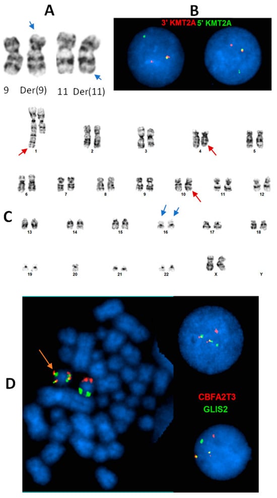 Infant AML is a distinct entity that occurs at a frequency of up to 25% of all pediatric AML. The predominant form in infants is AMKL, which is rare among other non-DS age groups [14,87]. AMKL is characterized by a blast count equal to 20% or greater with megakaryocytic differentiation [93]. Classifying AMKL by genetic abnormality is prognostic, and inferior outcomes are often identified in cohort studies. Indeed, many de novo cases can now be classified by their genomic rearrangements, t(1;22)(p13;q13) (RBM15::MRTFA), KMT2A (11q23) rearrangements (Figure 1A,B), inv(16)(p13.3q24.3) (BFA2T3::GLIS2) (Figure 1C,D), and t(5;11)(q35;p15) (NUP98::KMD5A) (Table 3). Prior to more advanced molecular techniques becoming mainstream in genetics laboratories, rearrangements involving the KMT2A locus or the t(1;22) translocation were the most commonly identified abnormalities in non-DS pediatric AMKL [94,95,96,97]. At that time, most karyotypes were normal and, therefore, were likely expected to result from nucleotide-level mutations. Instead, many recurrent gene fusions were later discovered and found to be cytogenetically cryptic. Now, such rearrangements can be identified using dual-color, dual-fusion FISH probes or break-apart FISH probes. Cohorts, therefore, differ in the frequency of rearrangements most commonly occurring that are associated with AMKL. Indeed, KMT2A rearrangements, NUP98 fusions, RBM15:MRTFA fusions, and CBFA2T3::GLIS2 fusions are the most common [14,93,94,98,99]. Other methods in recent years have become increasingly popular to identify the cryptic fusions (CBFA2T3::GLIS2, NUP98::KMD5A, KMT2A::MLLT10). These may include optical genome mapping, long-read sequencing, RNA sequencing, and, under the correct conditions, chromosomal microarray.