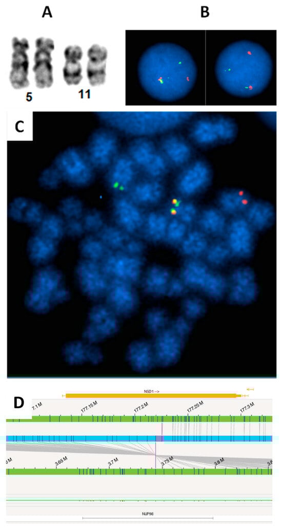 FISH revealed cryptic NUP98 (11p15) rearrangement in a pediatric AML patient. (A): Apparently normal chromosome 11p in karyotype. (B): Interphase FISH using break-apart probe identified NUP98 rearrangement (one fusion, one red, one green signal pattern). (C): Metaphase FISH suggests the NUP98 rearrangement likely resulted from a t(5;11) with 3′NUP98 probe translocated to the long arm of a chromosome, which is likely chromosome 5. (D). The NUP98::NSD1 fusion was identified by Optical Genome Mapping (OGM). The upper and lower green tracks indicate the genomic locus of NSD1 and NUP98, respectively. The blue track in the center indicates the fusion between the two genes, and the purple vertical lines spanning to the two green tracks show the fusion breaks on each green track.