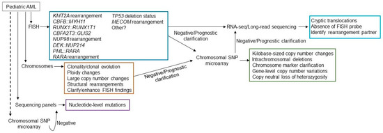 The diagnostic approach in de novo pediatric AML is best conducted in an algorithmic manner that plays the odds. Karyotype and FISH are typically the first approach and then, depending on the outcome, CMA. First-tier FISH should include translocations such as t(8;21), t(15;17), t(1;22), inv(16), KMT2A rearrangements, and copy number alterations (chromosomes 5/5q, 7/7q, 8). FISH would also be useful if the defined AML differentiation suggests that a cryptic translocation is likely (e.g., AMKL), in which case targeted probe sets may be employed. CMA can be helpful in identifying a loss of heterozygosity, especially involving recurrent target genes, intragenic and exonic deletions, and for kilobase-level copy number alterations that may be difficult to assess using sequencing techniques. Molecular approaches can be helpful if normal karyotypes are identified. Specifically, if FISH panels are limited, RNA sequencing or allele-specific assays may be helpful in identifying the numerous cryptic rearrangements, while DNA sequencing will be helpful in identifying gene mutations in the associated recurrent target genes.