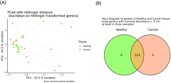 Additionally, no significant differences in α-diversity indices were identified (Figure S1), and the principal coordinate analysis computed using the Hellinger distance on transformed genera abundances did not reveal distinct clustering between the oncobiome and adjacent healthy tissues (Figure 2A). Finally, as shown in Figure 2B, all genera previously classified as “core microbiota” were present in both cancerous and adjacent tissues. These findings were further supported by the absence of differentially abundant taxa between these tissue types.