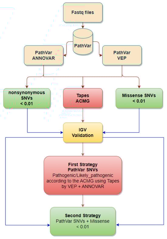 In our previous work, we used the pathogenic variant calling (PathVar) pipeline [60] to generate a list of candidate genes for burden testing. PathVar is a novel bioinformatics algorithm that integrates publicly available tools to detect single nucleotide variants (SNVs) and generate a list of candidate genes. PathVar operates through a three-stage process: variant calling, annotation and filtration, and pathogenicity assignment. The variant calling stage utilises the Genome Analysis Toolkit (GATK) tools [63], including Base Quality Score Recalibration (BQSR) and HaplotypeCaller, to produce variant call format (VCF) files. Annotation and filtration are performed using Annotate Variant (ANNOVAR) [64], Variant Effect Predictor (VEP) [65], and machine learning-based tools, such as Variant Quality Score Recalibration (VQSR), alongside GATK hard filtration. Finally, variants are classified according to ACMG criteria [66] using TAPES [67], a software tool to identify likely pathogenic variants. PathVar identifies variants classified as pathogenic or likely pathogenic by both VEP (v110.1) and ANNOVAR. By merging text files annotated with VEP and ANNOVAR using TAPES, it extracts variants with concordant pathogenic or likely pathogenic predictions, facilitating further analysis and interpretation (Figure 1). All variants were visually validated using the Integrative Genomic Viewer IGV (v2.19.4) [68]. In this study, we generated a final set of variants by selecting those that are predicted to be pathogenic or likely pathogenic by both VEP and ANNOVAR, are missense, and have a rare allele frequency (AF) of <0.01 [60]. We will refer to these as PathVar variants for the remainder of this research.