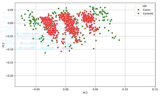 The final subset of SNVs used, comprising both rare and common variants, effectively captured the genetic stratification independent of the phenotype, as illustrated in Figure 2 and Figure 3. These figures demonstrate that the selected SNVs were able to distinguish between different population groups, indicating that they are informative about the underlying genetic differences of the individuals. The final subset of SNVs provides a robust and reliable set of markers for further analysis, allowing us to investigate the genetic associations with HM while minimising the impact of population stratification and other sources of bias.