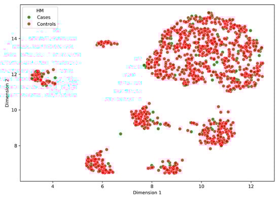 This UMAP plot provides clear evidence of genetic clusters independent of disease status. The figure represents the dimensionality reduction of 20 PCs into two dimensions, with the first dimension plotted on the X-axis and the second on the Y-axis. Data points are colour-coded according to phenotype: green dots indicate individuals with HM, while red dots represent the control cohort.