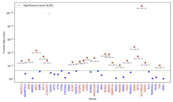 This figure illustrates the results of the burden testing analysis. PathVar genes were modelled against the phenotype column using the SKAT package in R. Only PathVar SNVs were included in this analysis. The Y-axis represents the p-value on a logarithmic scale, while the X-axis represents the genes. The dotted line indicates the significance threshold, with red dots corresponding to significant p-values and blue dots representing non-significant p-values. Significant genes are shown in red, while non-significant genes are depicted in blue.