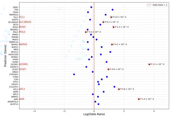 In our analysis, we utilised the SKAT package in R to conduct burden testing, modelling the effect of each gene in the genotype matrix against the phenotype column in the dataset. The results from the second strategy revealed that many genes exhibited significant associations with the phenotype, suggesting a statistically significant relationship between gene effects in the genotype matrix and HM. To further clarify these associations, we applied a standard logistic regression model (Figure 5). This approach allowed us to explore the relationship between significant genes and the case class in the phenotype column by estimating odds ratios to quantify effect sizes and beta coefficients to assess the direction of these relationships. It is important to note that these interpretations are statistical in nature and do not necessarily reflect biological mechanisms. The gene TYR was deemed insignificant, as its p-values from the Burden test were close to 0.05 (0.040). Meanwhile, POLE remained significant, and CYP24A1 became significant (Supplementary Figure S3), but both showed a negative beta coefficient (Figure 5), indicating an inverse relationship with HM.