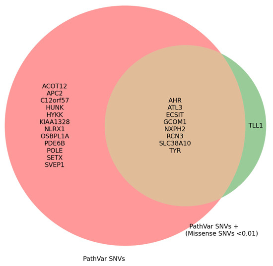 The inclusion of non-PathVar SNVs in the second strategy further diluted the relationship between PathVar SNVs and HM, weakening the associations observed in the first strategy. It appears that, as we move from including only PathVar SNVs to combining PathVar with missense and rare SNVs, the strength of the relationship progressively diminishes. The overlapping genes identified in both strategies, which potentially contribute to HM, are shown in Figure 6. This is also clear from the proportions of qualifying SNVs for the shared genes, as detailed in Table 2.