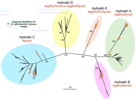 Maximum likelihood phylogeny of myticalins, highlighting the distinction among the five myticalin subfamilies (A, B, C, D, and E). For the sake of simplicity, only the bootstrap support values of the major nodes of the tree are shown. The placement of the myticalin sequences identified in the Mytilus californianus/M. coruscus lineage are highlighted by yellow stars.