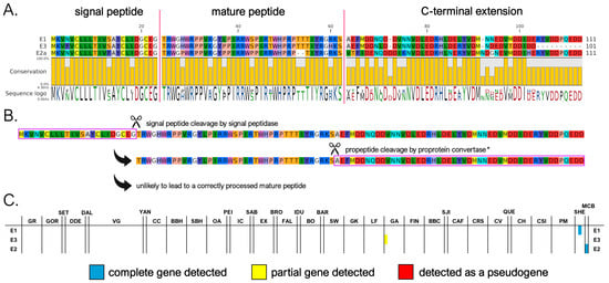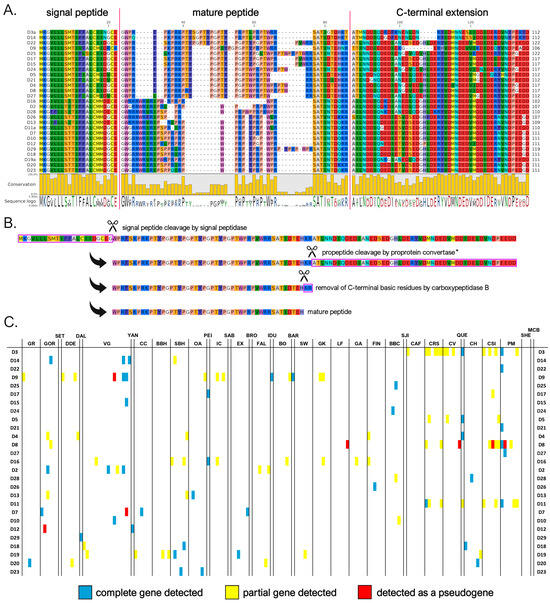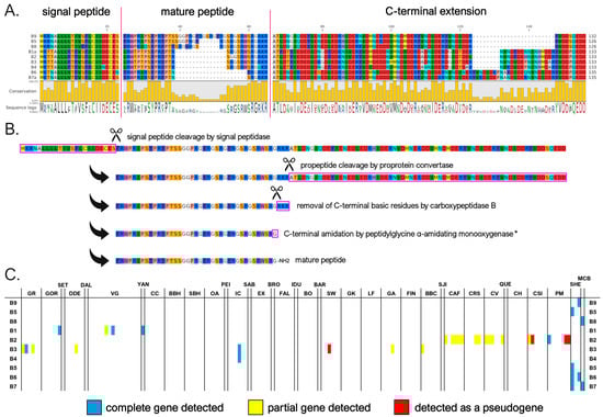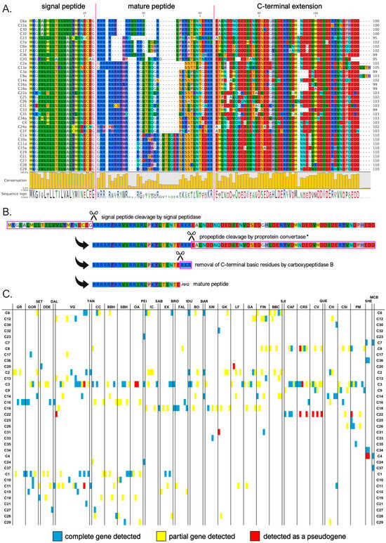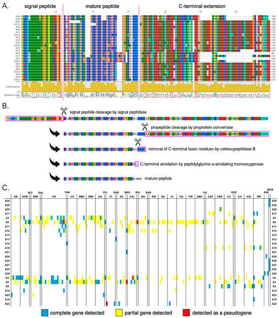 The CDS was virtually translated and the resulting amino acid sequences were manually annotated to identify the signal peptide, mature peptide, and C-terminal extension regions, as previously described [20]. Of note is that the mature peptide region is defined here as the peptide that would result from the proteolytic cleavage of the C-terminal extension before the occurrence of the additional post-translational modifications described in Section 3.3. Whenever a sequence lacked a canonical cleavage site, the C-terminal boundary of the mature peptide region was arbitrarily defined thanks to the multiple sequence alignment described in Section 2.3.
