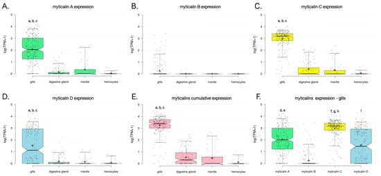 Expression level of myticalins, calculated based on the analysis of available RNA-seq datasets for species belonging to the Mytilus complex. Gene expression levels are reported as log10 (TPM+1). Each dot represents a single RNA-seq experiment and box plots indicate the median, 25th, and 75th percentile of expression ranges for each tissue. Whiskers indicate the 5th and 95th percentiles. The graphs report the cumulative gene expression levels of all myticalin sequences belonging to subfamily A (A), B (B), C (C), and D (D). No expression was detected for sequences belonging to subfamily E. (E) Shows the overall expression levels observed in the four tissues of all myticalin variants. (F) Displays a comparison between the gene expression levels of the four major myticalin subfamilies in the gills. Lowercase letters indicate statistically significant differences (i.e., p-value < 0.05), in the following pairwise comparisons among samples. a: gills vs. digestive gland; b: gills vs. mantle; c: gills vs. hemocytes; d: myticalin A vs. myticalin B; e: myticalin A vs. myticalin D; f: myticalin C vs. myticalin A; g: myticalin C vs. myticalin B; h: myticalin C vs. myticalin D; and i: myticalin D vs. myticalin B.