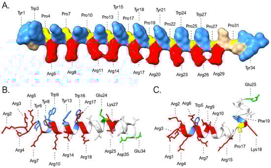 In their original description, myticalins were classified as “linear” AMPs due to the absence of cysteine residues. This feature distinguishes them from most other AMP families previously identified in bivalves, whose 3D structure is stabilized by multiple disulfide bonds. Moreover, circular dichroism spectra analyses have further suggested that myticalins may lack definitive α-helical or β-sheet conformations [21,22]. However, since the purification of native myticalins in sufficient quantities for crystallographic structural determination remains challenging, these data were collected through the analysis of a limited number of synthetic peptides. We report here a preliminary exploration of the structural properties of myticalins, thanks to the use of AlphaFold2 for predictive modeling [59]. Although the quality of the models was generally not satisfactory for the members of the myticalin B and D subfamilies, meaningful results were obtained for myticalins A and C. In detail, the presence of PRY/PRW repeats in myticalin A mature peptides led to the prediction of a backbone characterized by a periodic torsion, with about three residues per turn, which would exactly match the characteristics of polyproline II helices [71] (Figure 8A). This organization would result in a spatial segregation of charged arginine and aromatic (tyrosine/tryptophan) residues within the PRY/PRW repeats, generating amphipathicity, a feature critical for membrane disruption in AMPs. On the other hand, subfamily C peptides yielded high-confidence predictions (pLDDT > 80) that supported, in nearly all cases, α-helical conformations. The models often supported a characteristic kink between the arginine-rich N-terminal region and the C-terminal segment enriched in asparagine and threonine residues (Figure 8B,C).