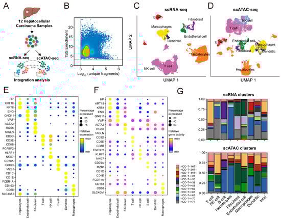 Single-cell multi-omics profiling and annotation of HCC samples. (A) Schematic overview of study design. Paired scRNA-seq and scATAC-seq data were obtained from 12 HCC patients for integrative analysis. (B) Quality assessment of scATAC-seq data showing transcription start site (TSS) enrichment versus log10-transformed unique fragment counts per cell. Each dot represents single cell, and colors indicate local cell density. (C,D) UMAP visualization of annotated cell types from scRNA-seq (C) and scATAC-seq (D) datasets. Each color represents different cell type. (E) Dotplot showing the expression of canonical marker genes across cell types identified in scRNA-seq. Dot size represents the percentage of cells expressing gene, and color indicates relative expression level. (F) Dotplot showing the chromatin accessibility at corresponding marker gene loci across cell types in scATAC-seq. Dot size represents the percentage of cells with accessible regions, and colors indicate relative gene activity score. (G) Bar plots comparing the cell-type compositions across samples for scRNA-seq (top) and scATAC-seq (bottom). Colors indicate cell-type identity.