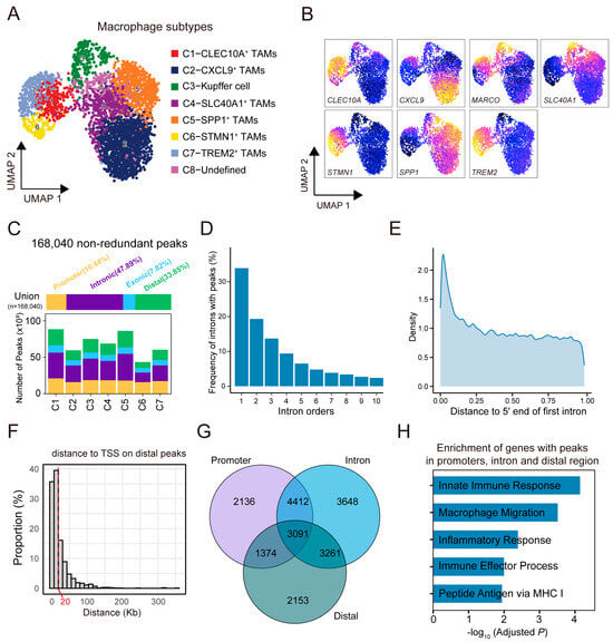 To investigate chromatin accessibility in distinct TAM subsets, we identified 168,040 non-redundant regions by merging peaks detected across individual subsets (Figure 3C). Genomic annotation of these peaks reveals a strong positional preference, with intronic and distal intergenic regions accounting for the largest proportions (Figure 3C and Figure S3A,B). Notably, the intronic peaks were predominantly located near the first intron and generally close to transcription start sites (TSSs), suggesting that many of these peaks reside in the 5′ region of the first intron (Figure 3D,E). Similarly, distal peaks were primarily located within 20 kb of nearby TSSs (Figure 3F and Figure S3C).