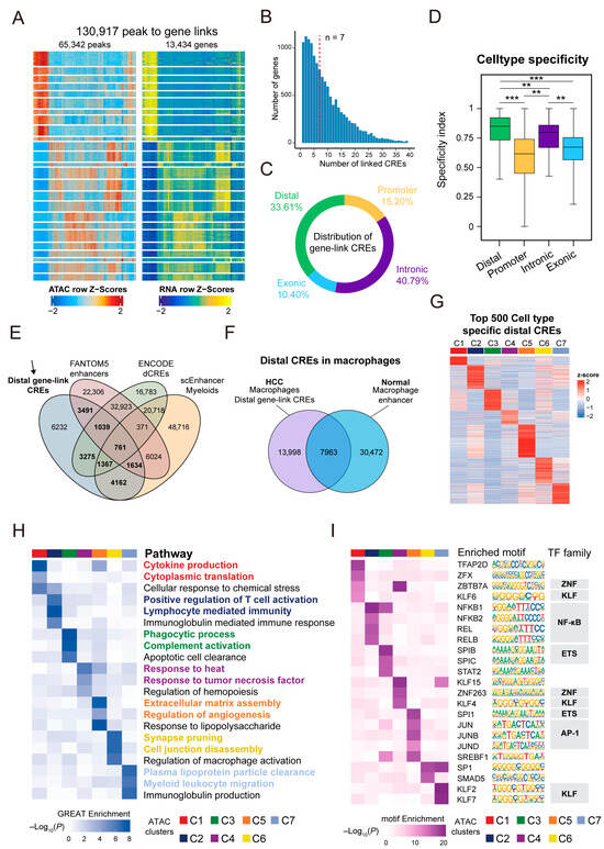 The above findings prompted us to further explore the cell-type-specific regulatory landscape of TAM subsets. As cis-regulatory elements (CREs) are defined as accessible genomic regions that influence gene expression [45,46], we performed peak-to-gene linkage analysis to associate chromatin accessibility peaks with the expression of nearby genes (within ±250 kb). Peaks showing a significant positive correlation with gene expression (correlation coefficients >0.4) were defined as candidate CREs. As a result, we identified 65,342 putative CREs across TAMs (Figure 4A). These CREs were linked to 13,434 genes, with each gene associated with a median of seven CREs, suggesting complex regulatory interactions between genes and their distal elements (Figure 4B). Notably, a substantial proportion of the CRE-linked genes overlapped with differentially expressed genes across TAM subtypes (Figure S4A), indicating that CREs may contribute to the transcriptional specificity of distinct macrophage states.