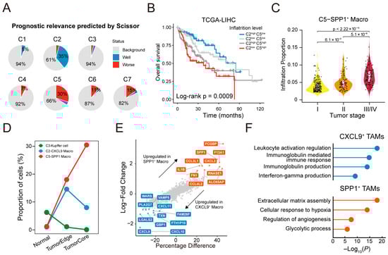 Identification of prognostically relevant TAM subtypes with divergent functional programs. (A) Pie charts show predicted prognostic relevance of each macrophage subtype based on Scissor analysis. Cells not assigned to well or worse prognosis were annotated as background cells. (B) Kaplan–Meier survival analysis in TCGA-LIHC cohort stratified by inferred infiltration levels of C2 (CXCL9+ TAMs) and C5 (SPP1+ TAMs) subtypes. (C) Violin plots show increasing infiltration of SPP1+ TAMs across tumor stages. (D) Line plot showing proportion of CXCL9+ and SPP1+ TAMs across normal adjacent, periphery, and core tumor regions. (E) Volcano plot showing differentially expressed genes between CXCL9+ and SPP1+ TAMs. (F) Enrichment of functional pathways based on DEGs in (E).