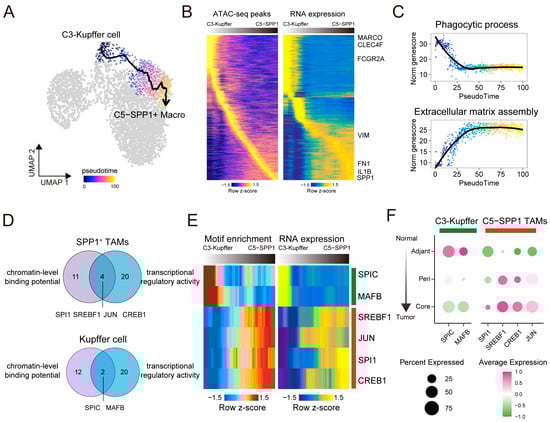 To explore this transition, we constructed a differentiation trajectory from KCs to SPP1+ TAMs (Figure 6A). Along this trajectory, chromatin accessibility and gene expression profiles reveal a gradual decline in KC-specific markers (MARCO, CLEC4F, and FCGR2A), while SPP1+ TAM-associated markers were progressively upregulated (SPP1, IL1B, FN1, and VIM) (Figure 6B). Functional analysis further supports the plausibility of this inferred transition. The canonical phagocytic program of KCs declined markedly, while extracellular matrix assembly pathways associated with SPP1+ TAMs were progressively activated during the transition (Figure 6C).