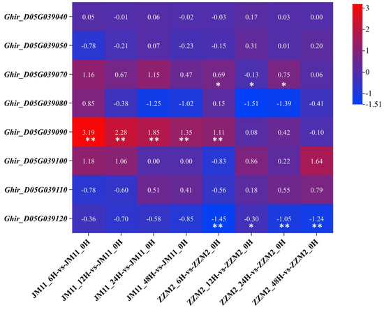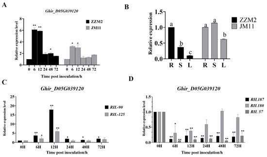 Expression levels of Ghir_D05G039120 in different cotton tissues (roots, stems, and leaves) were analyzed in the resistant cultivar ZZM2 and the susceptible cultivar JM11 by qRT-PCR. In ZZM2, the expression level of Ghir_D05G039120 was the highest in the root, followed by the stem, and the lowest in the leaf. In JM11, there was no significant difference in the expression level of Ghir_D05G039120 among roots, stems, and leaves. Compared with JM11, ZZM2 showed higher expression of Ghir_D05G039120 for the roots, but lower expression for the leaves, and no difference for the stems (Figure 2C).