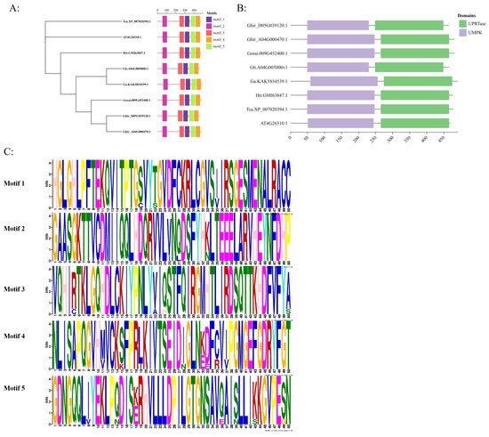 Based on a blast search on NCBI databses, 8 proteins entified to be homologous with Ghir_D05G039120 sed on phylogenetic analysis, four proteins from Gossypium, Ghir_A04G000470.1, Gorai.009G452400.1, GbA04G005000v1 and GaKAK5834539.1, shared a high homology with Ghir_D05G039120 which is 96.47%, 96.27%, 98.71%, and 95.23%, respectively (Figure 3A). Based on analyzing sequence similarity, it was found that these homologous proteins have the same motif at similar positions (Figure 3A,B) and share the same structural domains as those of the UKL family, namely UPRTase and UMPK (Figure 3C). Through protein sequence alignment, it is found that they have similar protein secondary and tertiary structures (Figure 3D). According to the sequence information of Ghir_D05G039120, the 5kb-long gDNA sequence of GhUKL4 was amplified using DNA of the resistant variety ZZM2 and the susceptible variety JM11 as templates. The sequence alignment showed that a SNP was identified in the 3′UTR of GhUKL4 between ZZM2 and JM11 (Figure 3E); however, its functional significance requires further investigation. It was determined that the Ghir_D05G039120 belongs to the UKL family, and therefore it was named GhUKL4.