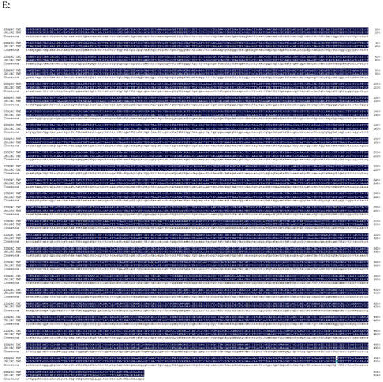 Genomic DNA (gDNA) and total RNA were isolated from cotton using TIANGEN Plant Genomic DNA and RNAprep Pure Plant Kits, respectively. cDNA was synthesized with HiScriptII Q Select RT SuperMix (+gDNA wiper, Vazyme, Nanjing, China). The GhUKL4 (Ghir_D05G039120) sequences were amplified via PCR (Bio-Rad C1000, Bio-Rad, Hercules, CA, USA) under the following conditions: Primers: Designed against Ghir_D05G039120 genomic (gDNA) or mRNA (cDNA) sequences. Cycling: 94 °C/10 min; 34 cycles of 98 °C/30 s, 60 °C/30 s, 72 °C/90 s per kb; 72 °C/10 min. Reaction system 1× KOD-Plus-Neo buffer, 0.2 mM dNTPs, 1.5 mM MgSO4, 0.3 μM primers, 0.4 U KOD-Plus-Neo (TOYOBO, Osaka, Japan), 200 ng template. PCR products were electrophoresed, purified (FastPure Gel DNA Kit, Vazyme, Nanjing, China), cloned into pEASY-Blunt Zero vector (TransGen, Beijing, China), and sequenced (GENEWIZ, South Plainfield, NJ, USA).
