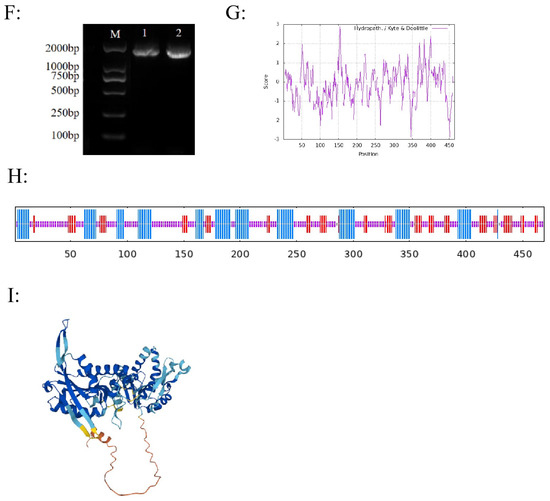 Using cDNA from ZZM2 and JM11 as templates, the CDS region of GhUKL4 was cloned, and a coding region sequence of 1398 bp was obtained (Figure 3F). The protein encoded by the GhUKL4 gene contains 465 amino acids, and there was no difference in the CDS region of GhUKL4 between the two materials, indicating that the gene has a certain stability in inheritance in resistant and susceptible materials. The relative molecular weight of GhUKL4 is 52.17 kDa, and the theoretical isoelectric point is 6.37. The amino acids with higher content are isoleucine 9.5%, aspartic acid 8.8%, leucine 8.4%, valine 8.0%, and glycine 7.5%. Among them, there are 60 amino acid residues with negative charges and 54 amino acid residues with positive charges. The instability index of this protein is 33.31, indicating that it is a stable protein. The analysis of hydrophilicity and hydrophobicity suggests that the protein may be hydrophilic (Figure 3G). The secondary structure (Figure 3H) and tertiary structure (Figure 3I) of the GhUKL4 protein were predicted using NPSA and Swissmodel, respectively. The protein mainly contains three secondary structures: irregular coil (60.77%), alpha helix (23.45%), and main chain extension (15.78%).