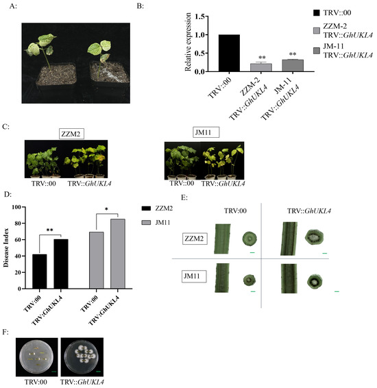 The resistance function analysis of the GhUKL4 gene using VIGS. (A): Phenotypes of cotton seedlings with GhPDS silenced. (B): qRT-PCR analysis of the expression levels of GhUKL4 in the silenced lines. “**” represent significant differences relative to each control and p-value < 0.01, based on Student’s t-test. (C): The phenotypes of ZZM2 and JM11 under infection with V. dahliae after VIGS with Agrobacterium carrying TRV::GhUKL4 and TRV::00, and the photos were taken at 35 days after V. dahliae inoculation. (D): The disease index of plants with silenced GhUKL4. The qRT-PCR data were expressed relative to each control. The results were evaluated at 40 d after V. dahliae inoculation, with three replications containing at least 20 plants each. “*”, “**” represent significant differences relative to each control and p < 0.05 or p-value < 0.01, based on Student’s t-test. Each value was the mean ± SD of three biological determinations. (E): Vascular tissues of TRV::00 and TRV::GhUKL4 plants infected with V. dahliae. Scale bars = 1 cm. (F): Fungal recovery experiments. Scale bars = 1 cm.