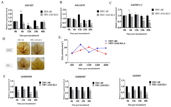 Plant hormones, such as JA, are robust signaling molecules that modulate host–pathogen interactions [41]. To explore the regulatory linkage between GhUKL4 and defense signaling mediated JA pathways, we detected the transcript levels of related genes involved in the JA pathway in mock (TRV:00) and TRV::GhUKL4 plants derived from ZZM2 infected by V991. Results showed that relative expression of JA signaling-related genes (GhJAZ1, GhJAZ10, and GhPDF1.2) was down-regulated in TRV::GhUKL4 plants, compared with the mock (Figure 5A–C).
