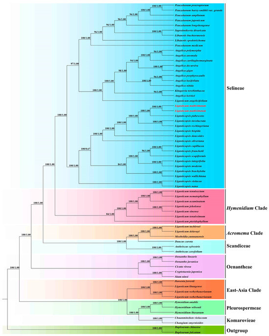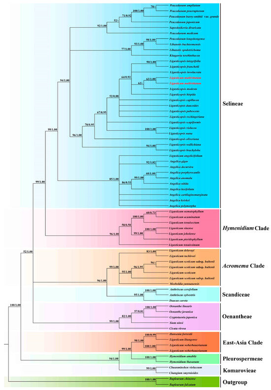 To confirm the taxonomic placement of Ligusticum multivittatum, we used two datasets to reconstruct the phylogenetic trees. Dataset 1 was 66 plastome sequences and dataset 2 was 69 ITS sequences (Table S1). According to the previous study, Bupleurum chinense Franch. and B. falcatum L. were selected as outgroups [22]. The software MAFFT v7.221 [23] was used to align the ITS and plastome sequences and adjusted manually when necessary. Maximum likelihood analysis (ML) and Bayesian inference (BI) were used to perform the phylogenetic analyses. For ML analysis, referring to the RAxML manual, RAxML v8.2.8 [24] with 1000 replicates and GTRGAMMA model was used to reconstruct the phylogenetic tree and estimate the value of bootstrap support (BS) for each node. For BI analysis, MrBayes v3.2.7 [25] was performed to reconstruct the phylogenetic trees and the best-fit substitution model (GTR+I+G) for both datasets were determined by Modeltest v3.7 [26]. Two independent Markov chain Monte Carlo (MCMC) algorithms were run for 1,000,000 generations, sampling every 100 generations. When the average standard deviation of the splitting frequency dropped below 0.01, the MCMC running finished. Then, we discarded the initial 25% of trees and used the reminders to yield the consensus tree and estimate posterior probabilities (PP). Finally, the software FigTree v1.4.2 [27] and the online tool iTOL (https://itol.embl.de/itol.cgi, accessed on 2 May 2025) [28] were used to edit and visualize the phylogenetic trees.