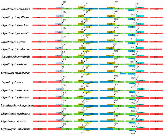The analysis of the borders of LSC/IRs and SSC/IRs showed that LSC/IRa, IRa/SSC, SSC/IRb had similar IR boundaries and the adjacent genes were also identical (Figure 5). In detail, ycf2 gene crossed the LSC/IRa junction and expanded 573–601 bp into IRa region. At the IRa/SSC boundary, except for the ndhF gene of Ligusticopsis capillacea expanding to the IR region with length of 72 bp, the ndhF gene of other species were far away from the IRa/SSC boundary, with length of 6–70 bp. The ycf1 gene, crossing the SSC/IRb junction, expanded 1984–2983 bp into the IRb region. IRb/LSC boundary was located between trnL and trnH genes in fifteen Ligusticopsis plastomes, with the trnL gene were 1783–2770 bp away from LSC region and trnH gene had 1–13 bp away from IRb regions, while in Ligusticum multivittatum plastome, the IRb/LSC border was located between ndhB and trnH genes and ndhB was far away from LSC region with 2029 bp (Figure 5).