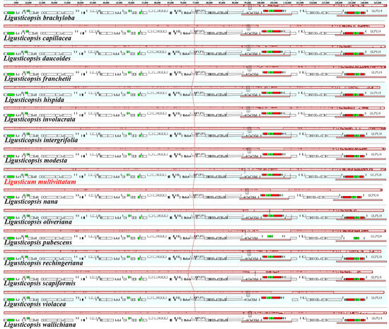 We downloaded sixteen plastomes (Ligusticum multivittatum plastome and fifteen Ligusticopsis plastomes) from NCBI databases (Table S1) and annotated them using Geneious R11 (Biomatters Ltd., Auckland, New Zealand) [29]. For plastome comparison analyses, we first compared the IR/SC boundaries of these sixteen plastome sequences using Geneious R11 (Biomatters Ltd., Auckland, New Zealand) [29] and visualized it after manually adjusted. Then, we detected the possible gene rearrangements among these sixteen sequences using the whole genome alignment tool Mauve v1.1.3 plugin [30] in Geneious R11 (Biomatters Ltd., Auckland, New Zealand) [29], setting other parameters as the default values. Finally, we investigated the degree of variation sequences of these sixteen sequences using the LAGAN model implemented in mVISTA tool [31] with Ligusticopsis brachyloba (Franch.) Leute as the reference.