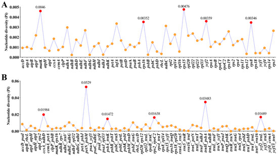 Comparative analysis of nucleotide diversity (Pi) values among sixteen plastomes. (A): protein coding regions; (B): non-coding and intron regions.