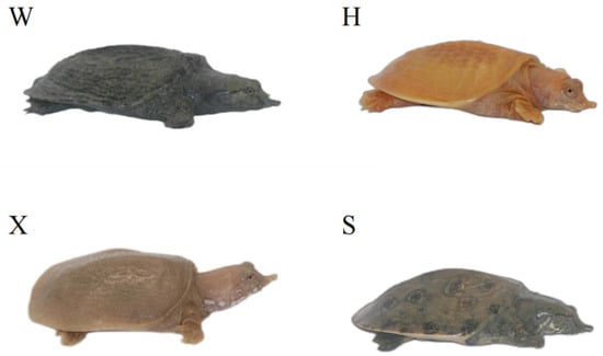 Phenotypic photographs of P. sinensis individuals with four different body colors. The four individuals are referred to as the Qingxi black strain (W), Yongzhang golden strain (H), albino strain (X), and Huangsha strain (S).
