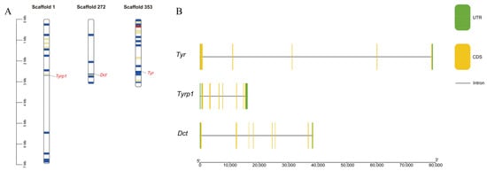 Our chromosome localization analysis showed that the three screened TYR gene family members were distributed on chromosome scaffold 1, chromosome scaffold 272, and chromosome scaffold 353, respectively (Figure 2A). In the gene structure analysis, there were differences in the gene length, coding sequences, and introns of the three TYR gene family members. The TYR gene had five coding sequences and four introns. The TYRP1 gene had seven coding sequences and seven introns. Finally, the DCT gene had eight coding sequences and seven introns (Figure 2B).