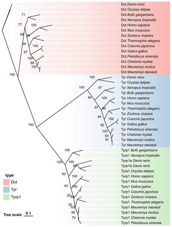 Phylogenetic tree of the relationship of the TYR gene family members in P. sinensis with other vertebrates.