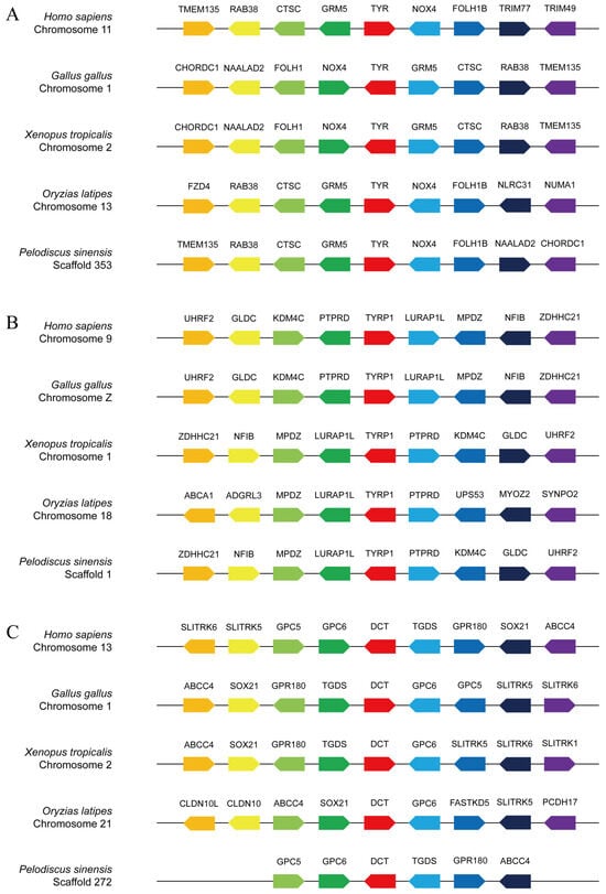 Collinear analyses of TYR (A), TYRP1 (B), and DCT (C) between P. sinensis and other animals. The direction of the arrow indicates the transcription direction, and each solid line represents a chromosome scaffold.