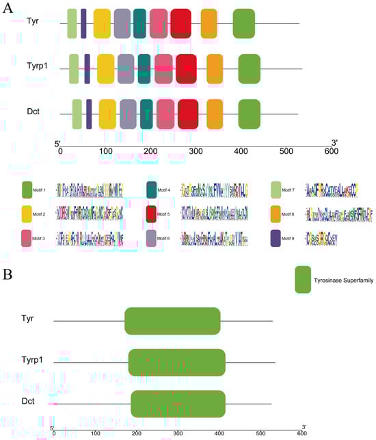 Through amino acid sequence conservation region prediction, nine of the most conserved motifs were obtained (Figure 5A), which were all in the TYR, TYRP1, and DCT gene amino acid sequence. In addition, the three TYR gene family proteins contained the same domain, namely the Tyrosinase Superfamily (Figure 5B). Our results showed that these protein motifs were highly conserved.
