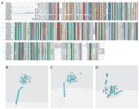 The results of the amino acid sequence alignment indicated that the three TYR gene family proteins (TYR, TYRP1, and DCT) were highly conserved in multiple critical regions across the nine species. All sequences featured hydrophobic amino acids in their N- and C-terminal segments. Moreover, they all contained multiple conserved Cys and histidine (His) residues. The sequence alignment results for TYR protein showed that the similarity between P. sinensis and other Testudines species is above 97%, while the lowest similarity is with fish, at only 76.3%. The sequence alignment results for TYRP1 protein indicated that the similarity between P. sinensis and other Testudines species is above 91%, while the lowest similarity is with amphibians, at only 82.2%. The sequence alignment results for DCT protein revealed that the similarity between P. sinensis and other Testudines species is above 91%, while the lowest similarity is with fish, at only 76% (Figure 6A). The results of our protein 3D structure model prediction of the three TYR gene family members showed that the tertiary structure of TYR, TYRP1, and DCT proteins mainly consisted of α-helices, β-turns, random coils, and extended strands (Figure 6B–D). Specifically, the proportions of TYR protein were 28.36%, 1.89%, 59.17%, and 10.59%. The proportions of TYRP1 protein were 30.65%, 1.87%, 56.45%, and 11.03%, while those of DCT protein were 29.85%, 3.80%, 52.85%, and 13.50%.